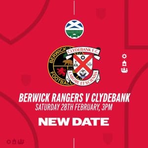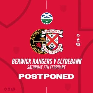 Following an early pitch inspection, tomorrow’s scheduled trip to Berwick Rangers has been postponed due to a waterlogged pitch at Shielfield Park. A new date will be announced in due course.