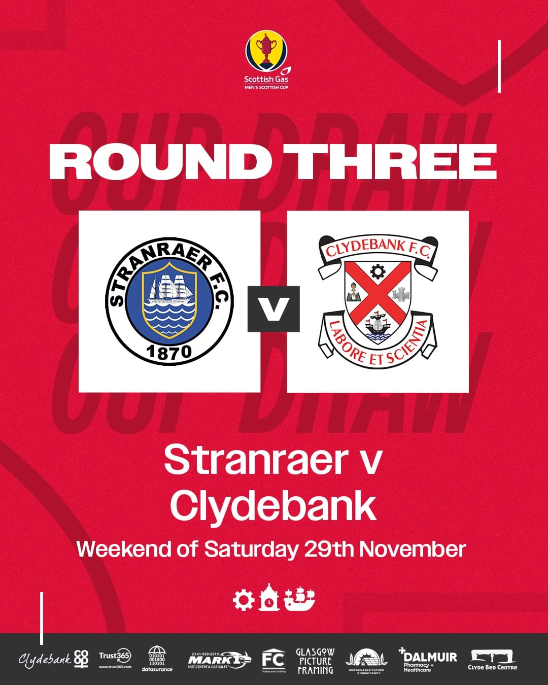 Clydebank have been drawn away to Scottish League Two side Stranraer in the third round of the Scottish Cup.